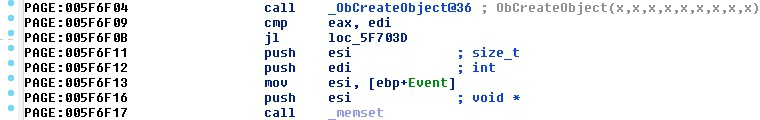 Figure 2. A direct memset function call to reset memory in nt!NtCreateJobObject (Windows 7)