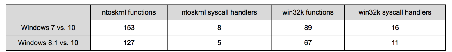 4、Filtered the output of the previous step against the list of functions present in the older kernels (7 or 8.1, again pulled from IDA Pro), to make sure that we didn't include routines which were only introduced in the latest system.