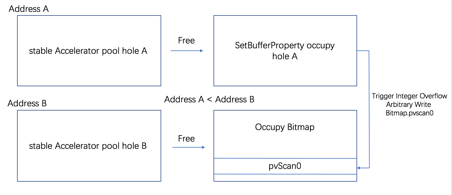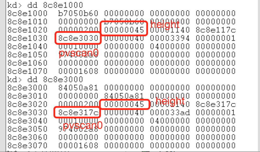 通过这种方法可以制造一个0x20的pool hole,然后可以利用整型溢出覆盖到布局在后面bitmap的pvscan0,从而完成data attack,但是这种情况有问题,一会会提到。