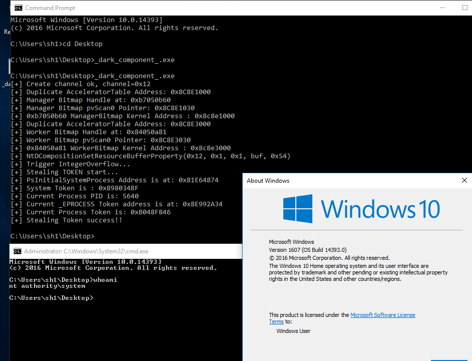 这篇的基础是360 vulcan team的邱神和社哥在cansecwest2017的议题《Win32k Dark Composition--Attacking the Shadow Part of Graphic Subsystem》,我2017年在博客发了第一篇(地址:https://whereisk0shl.top/Dark%20Composition%20Exploit%20in%20Ring0.html)关于议题中的第一个double free漏洞demo的exploit过程,这篇文章则是对另一个integer overflow漏洞demo的exploit过程,我利用这两天时间完成了这个win32kbase.sys中的整型溢出漏洞的exploit,和大家分享一下从漏洞分析到完成exploit的过程,以及一些疑惑和坑,也请师傅们多多交流讨论,感谢阅读!