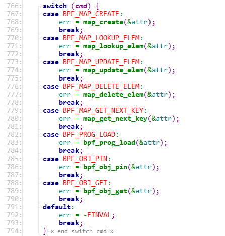 完成socket过滤器的初始化,关于bpf的系统调用的实现在kernel/bpf/syscall.c中,关于prep()和pwn()中的系统调用实现都在这个switch中。