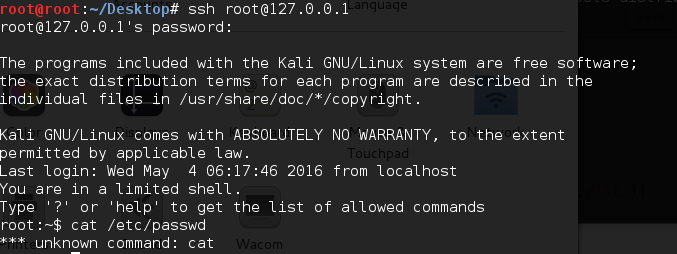 首先通过chsh命令,将root用户的shell替换成lshell,通过ssh连接主机,可以看到,部分命令是禁止执行的,比如cat命令,执行时会提示找不到命令。