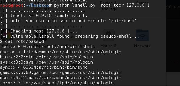 这时运行lshell.py,这个poc会先检测lshell的版本,存在漏洞的版本,会提示输入命令,使用之前ssh后不能执行的cat命令,发现cat命令顺利执行了,并且/etc/passwd顺利回显。