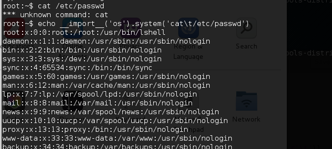 在这个工具中,由于对于echo后面命令的控制不够严格,导致可以通过调用python语法导致执行不可执行的命令,下面对此漏洞进行详细分析。